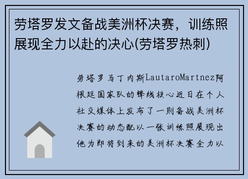 劳塔罗·马丁内斯(Lautaro Martínez),阿根廷国家队的锋线核心,近日在个人社交媒体上发布了一则备战美洲杯决赛的动态,配以一张训练照,展现出他为即将到来的美洲杯决赛全力以赴的决心。这张照片和发文不仅展现了他强烈的比赛欲望,也让球迷们感受到他对国家队的责任感和对胜利的渴望。本文将围绕劳塔罗的发文、他的训练态度以及美洲杯决赛的重大意义,进行详细剖析。