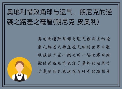本文将围绕奥地利惜败的比赛展开,分析角球、运气以及朗尼克战术的影响,探讨这些因素如何共同塑造了这场充满遗憾的比赛,同时深入剖析朗尼克的逆袭之路,揭示这位战术大师如何在困境中找到突破口,并如何将微小的差距转化为未来的胜利契机。