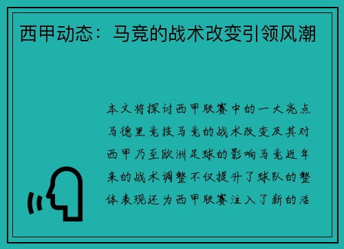 本文将探讨西甲联赛中的一大亮点——马德里竞技(马竞)的战术改变及其对西甲乃至欧洲足球的影响。马竞近年来的战术调整不仅提升了球队的整体表现,还为西甲联赛注入了新的活力。尤其在主帅迭戈·西蒙尼的带领下,马竞开始逐渐摒弃传统的防守反击风格,向更加灵活、多变的进攻战术转型。本文将从四个方面详细分析这一战术转变:一是马竞战术变化的背景与原因,二是新战术对球员角色和整体配合的影响,三是战术转型带来的竞争优势,四是马竞战术变化的未来展望。通过深入探讨这些方面,本文旨在揭示马竞战术变化背后的深层逻辑,以及其在西甲和国际赛场上的重要意义。